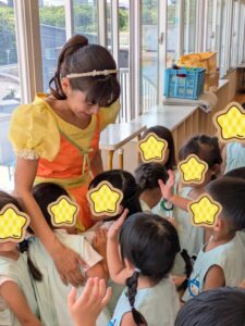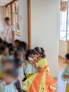 あれっ!!いつの間に!?衣装のリボンを子どもたちが持っていたので女の子の頭に付けて遊んだよ♬